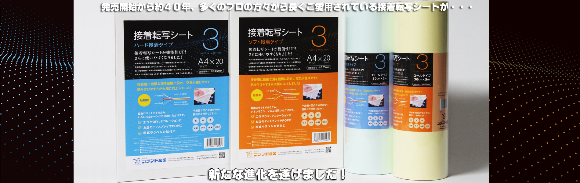 接着転写シートシリーズにさらに使いやすくなった接着転写シート3が発売されました!ノリのように使える接着層超薄タイプ定番の「接着転写シート1」はそのままに、接着転写シート2のユーザー様から寄せられたニーズにより高い接着力を持つ「ハード接着タイプ」と一度貼っても貼り直しを行い易い「ソフト接着タイプ」が接着転写シート3としてリニューアル。接着転写シートは発売以来、さまざまな市場や業界で業務用途として使用されるほか作品制作を行う多くのクリエイターの方々にも長年ご愛用いただいております。一般的に販売されている両面接着テープとは異なるプロフェッショナルから認められた接着転写シートをぜひお試しください。ぜひお使いください。