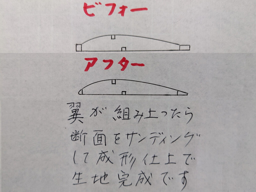 ピーナッツ屋は此れを生地完と言って居ます。この生地に紙を張るために防水処理でドープ又は3倍に薄めたクリアラッカーを塗り生地完と成ります。組み上がった翼はサンディングブロックでサンディング成形します。
