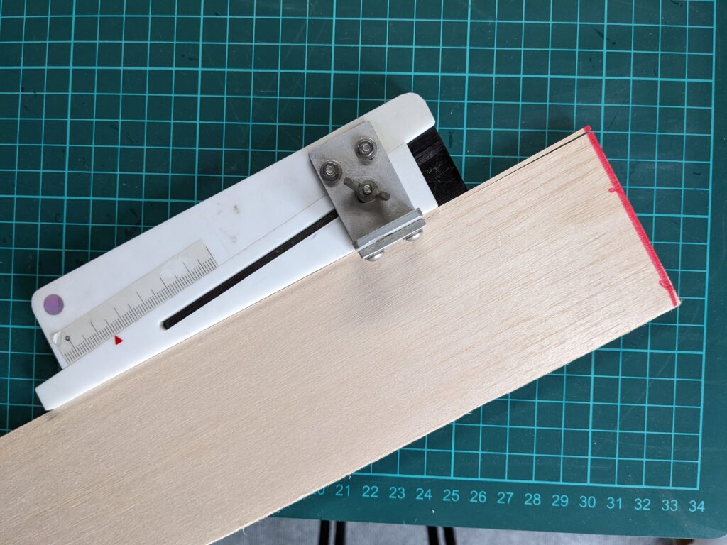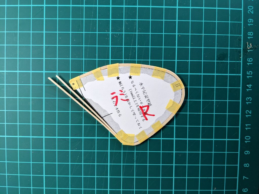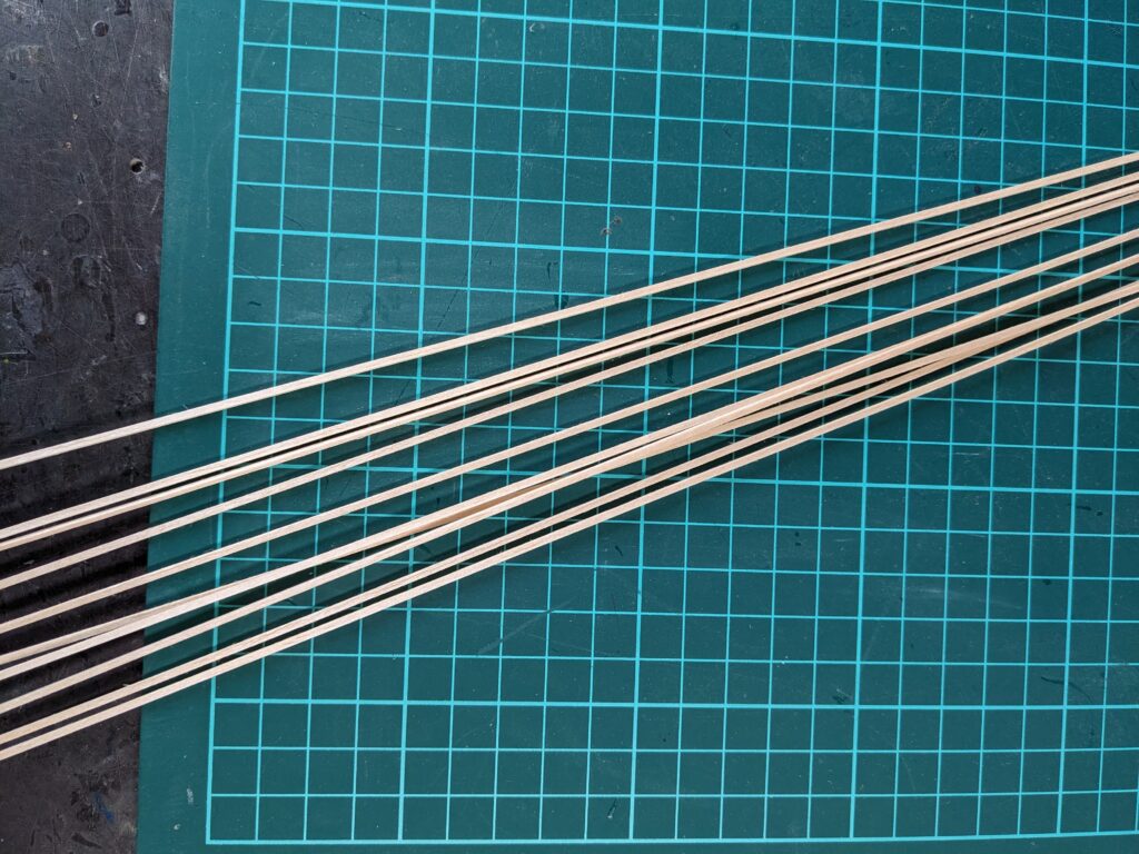 1,5〜2ミリ断面のエクアドル産のバルサ棒材をカッターナイフと定規で切り出し、サンディング出来る木工ボンドで型紙にマスキングテープで固定しながら貼付け乾燥後パーツとして使います。