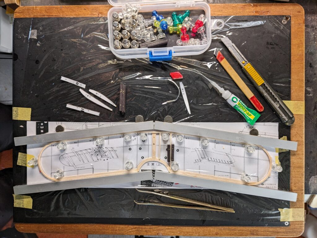 翼の組立ては先ず木の板を定盤にした場合プランを盤上にマスキングテープで止めラップで覆い、一般的には必要なパーツを待ち針で固定しながら瞬間接着材で組み立てますが、私は鉄板ボードで磁石で固定組み立てています。