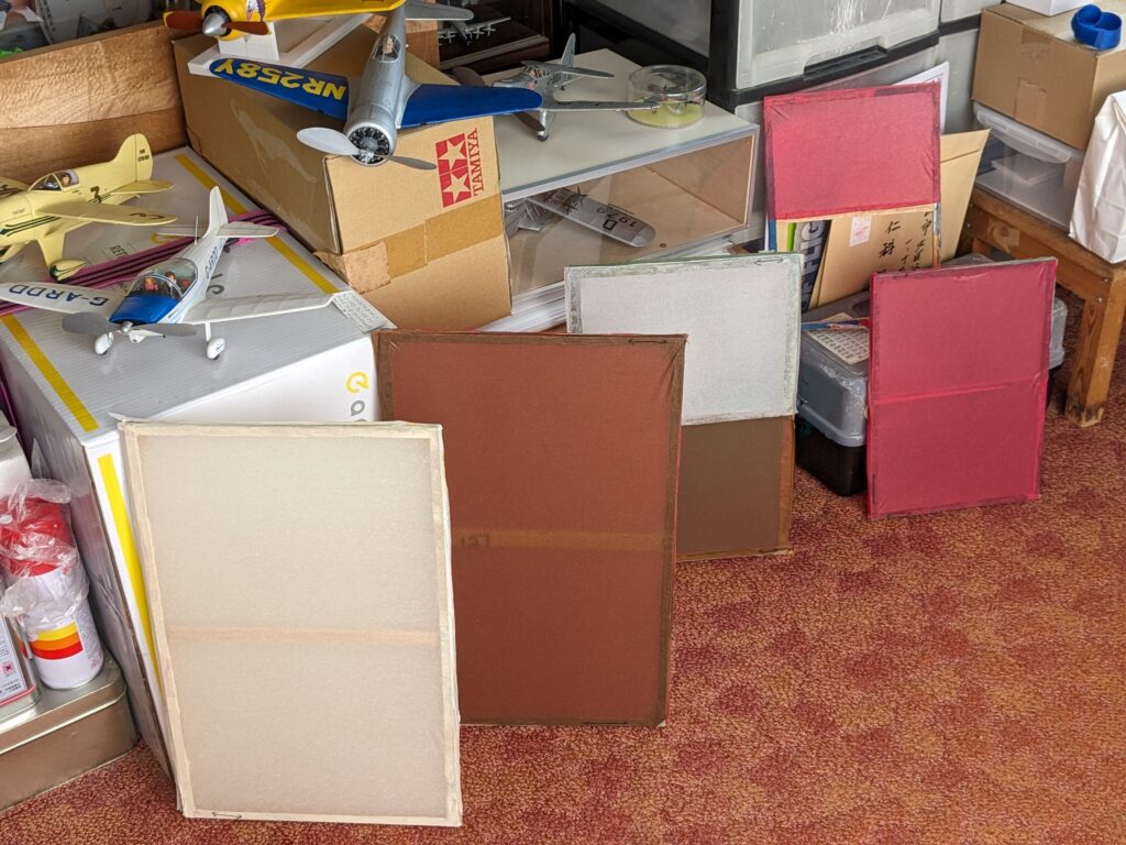 紙を機体にそのまま貼ってしわ取りの霧吹きをすると、紙が強力に収縮して翼胴体に歪みが出て失敗に終わるのを防ぐため、事前にプレシュリンク(霧吹きで収縮)させます。写真は木枠に紙を張りシュリンク中です。