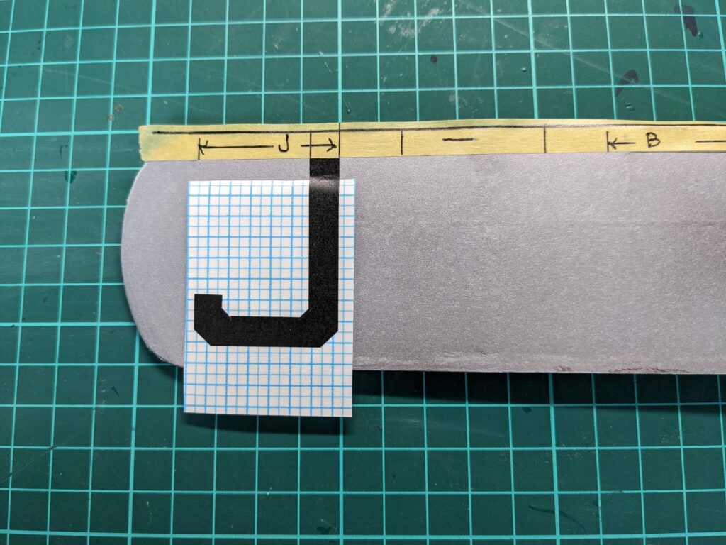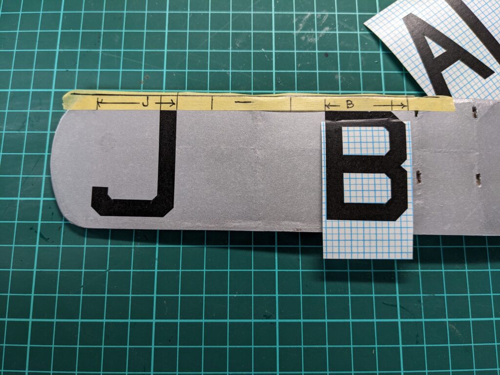 先ずレター原稿を翼の上に置き位置決めをし、レター文字の順番を書いたマスキングテープを貼り付け、 そのテープに沿ってレターシール文字を配置して貼り込みます。貼り込み方法はレター用の紙を接着転写シートの上に貼る時と同じ考えで文字は一字ずつ切り離します。