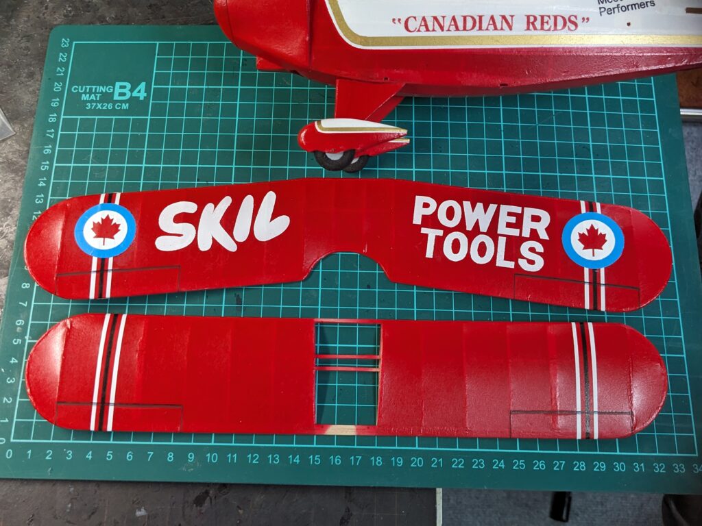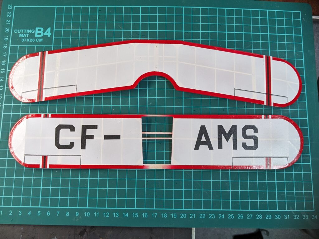 翼の3色ライン、主翼上面のロゴタイプ、文字、翼下面のレター、胴体のゴールドラインなどは全て接着転写シート1を使用しております。3色ラインとカナダ空軍国籍マークも接着転写シートの2重貼りです。