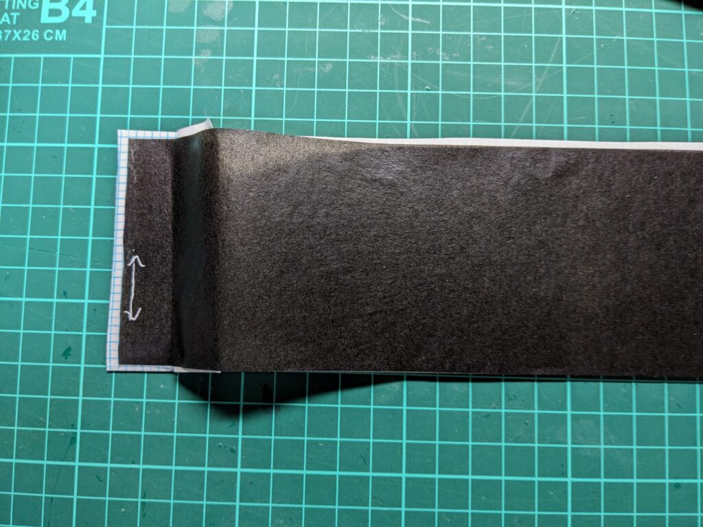 ずレター用の色紙を用意します。黒なので翼紙にエアーブラシで着色した物を使います。接着転写シートを必要な大きさにカットしてそれに紙を貼りますが、セパレーターを全部剥がして貼り付けようとするとほぼ失敗します。其処でセパレーターの端っこを1センチくらい捲り確りと折り癖を付けておきます。